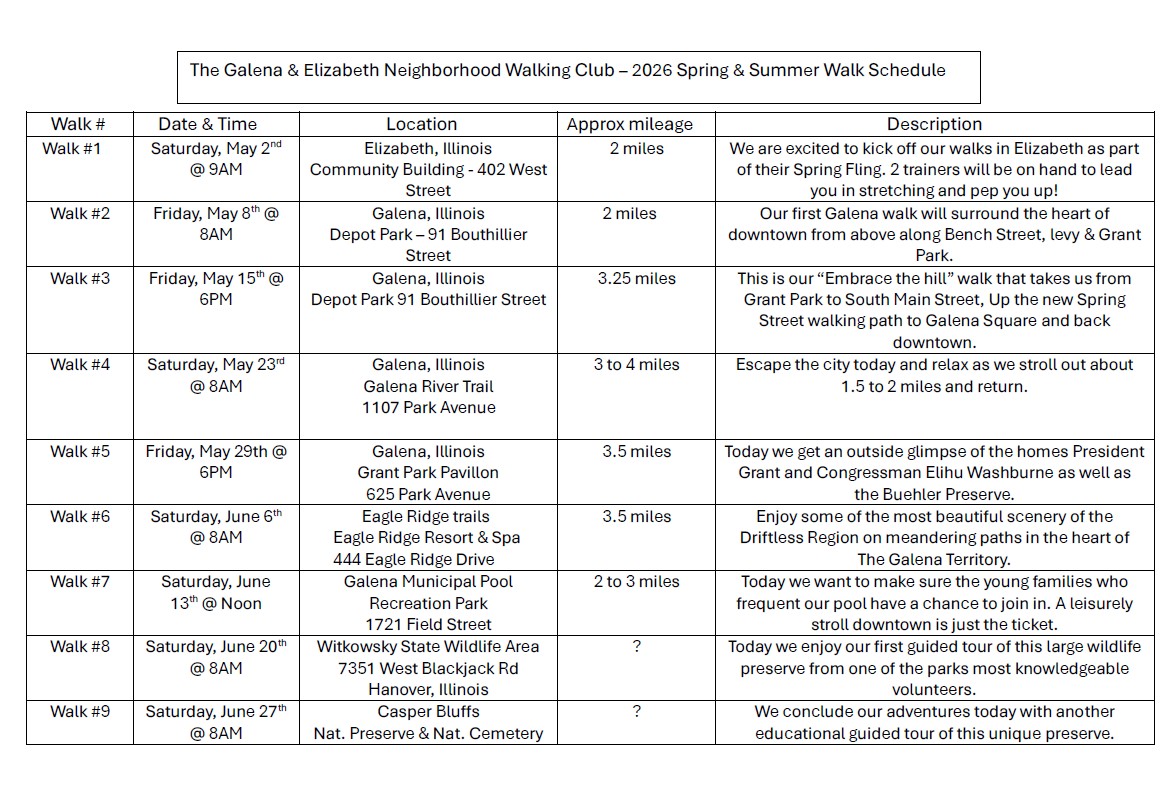 Participants are encouraged to join the Galena & Elizabeth Neighborhood Walk Club, which will keep members moving and smiling beyond this initial series. The club is free, and a t-shirt is available (while supplies last) for in-person registrants at the first walk.